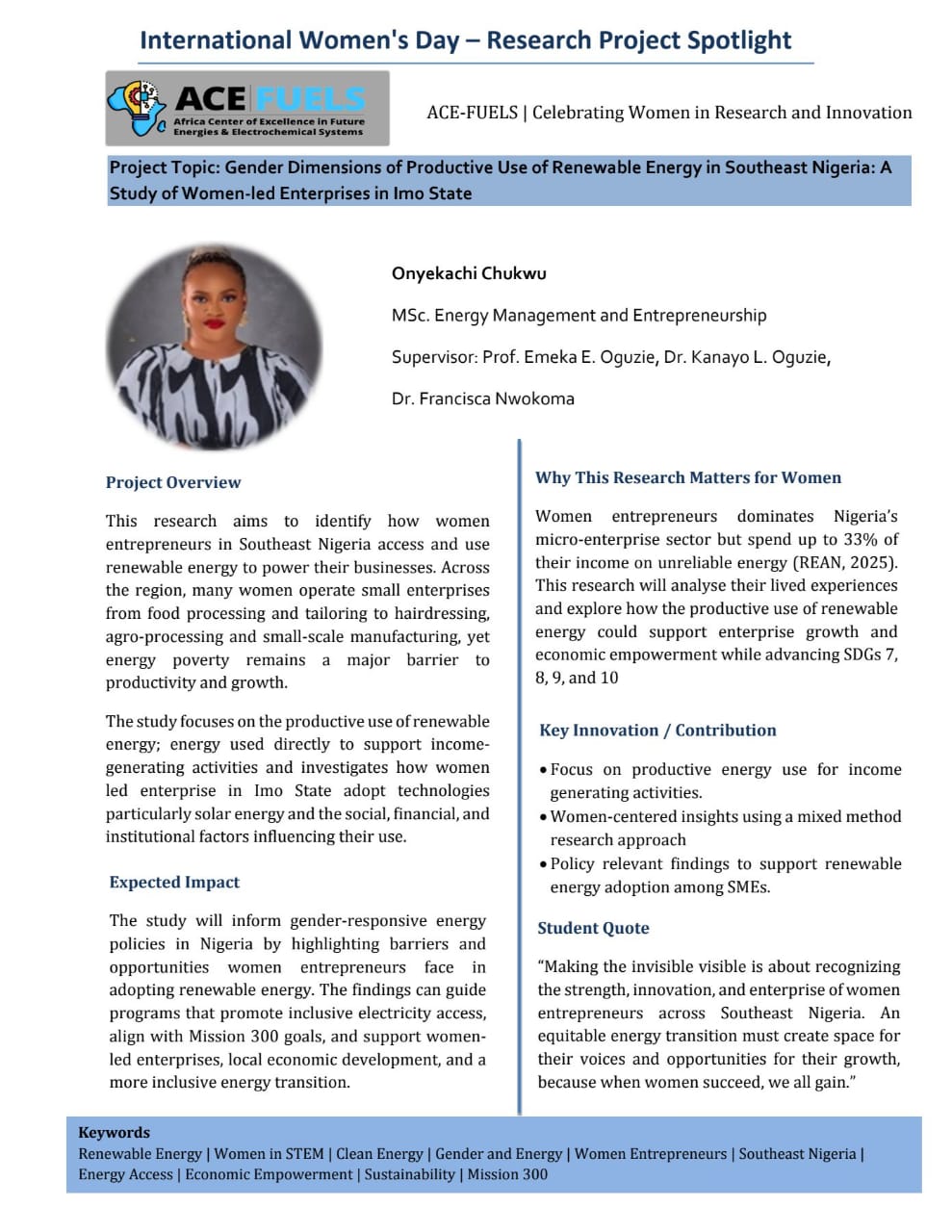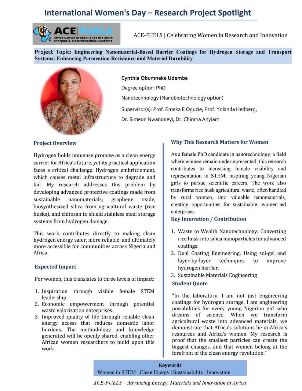 In celebration of International Women’s Day, ACE-FUELS at the Federal University of Technology Owerri (FUTO) is proud to launch the Women in Research Spotlight Series.